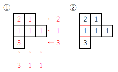 図の赤色のようにその場所には何段重なっているかという数字を書き込む。